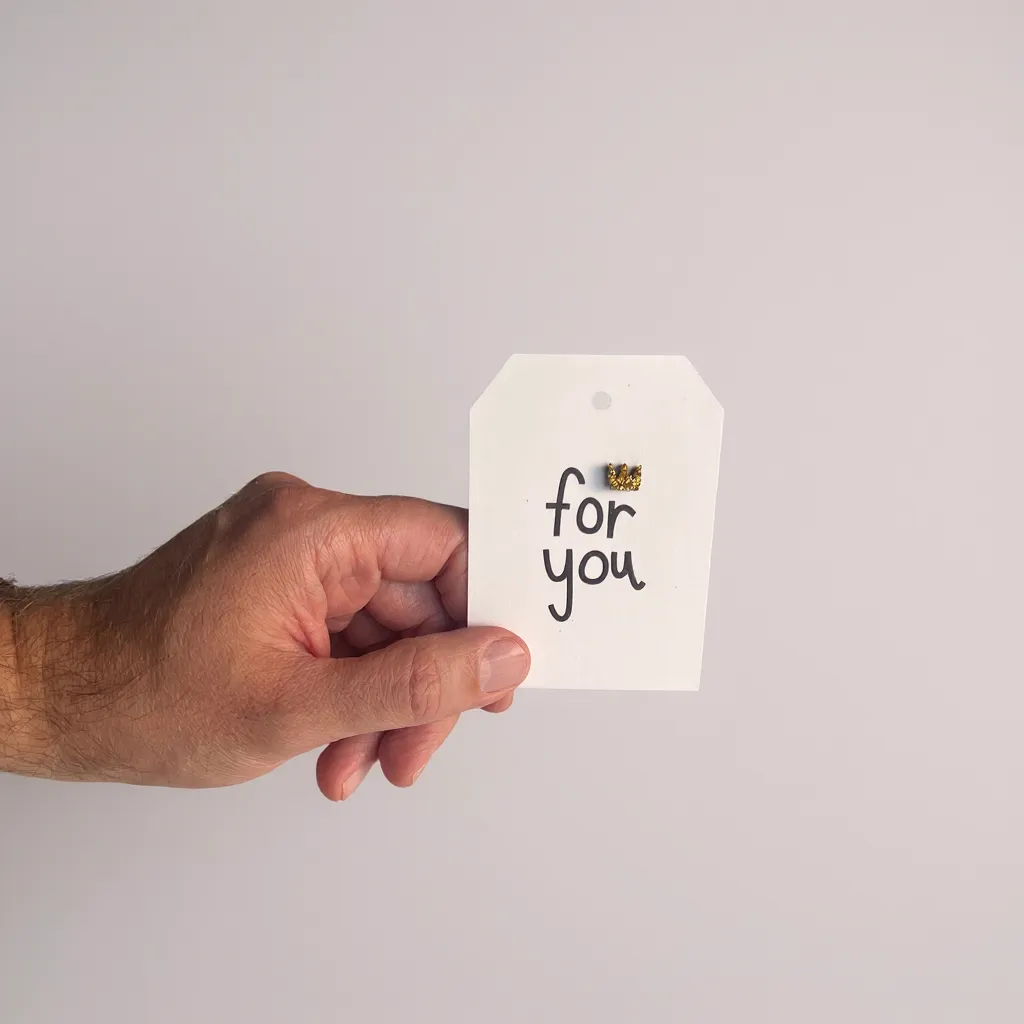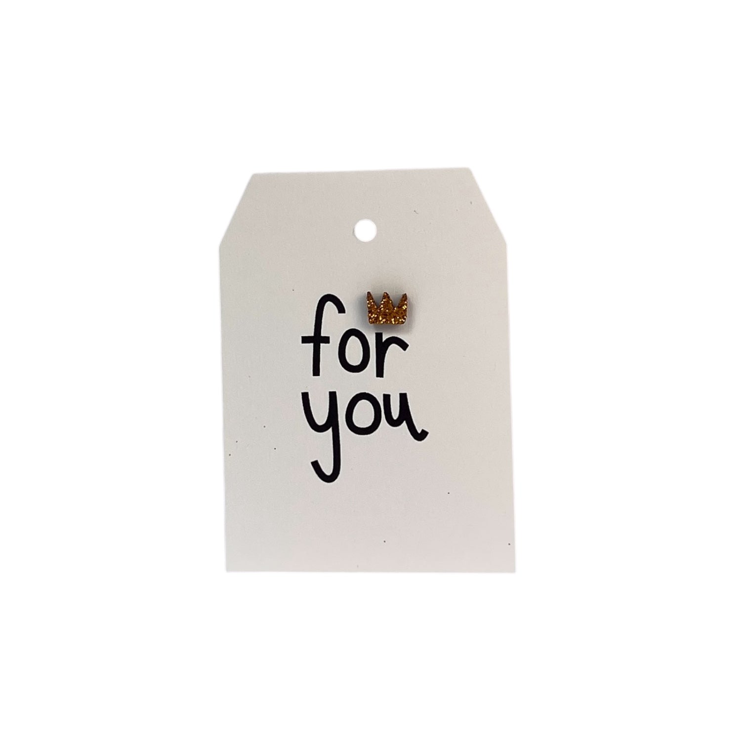Minimalistyczna kartka z napisem „for you” i złotą drewnianą koroną.
