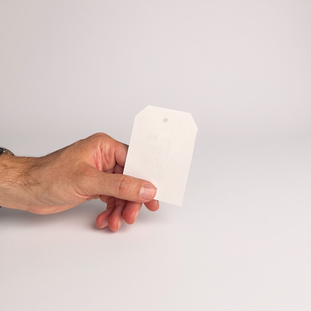 Papierowa kartka z drewnianym misiem machającym łapką.