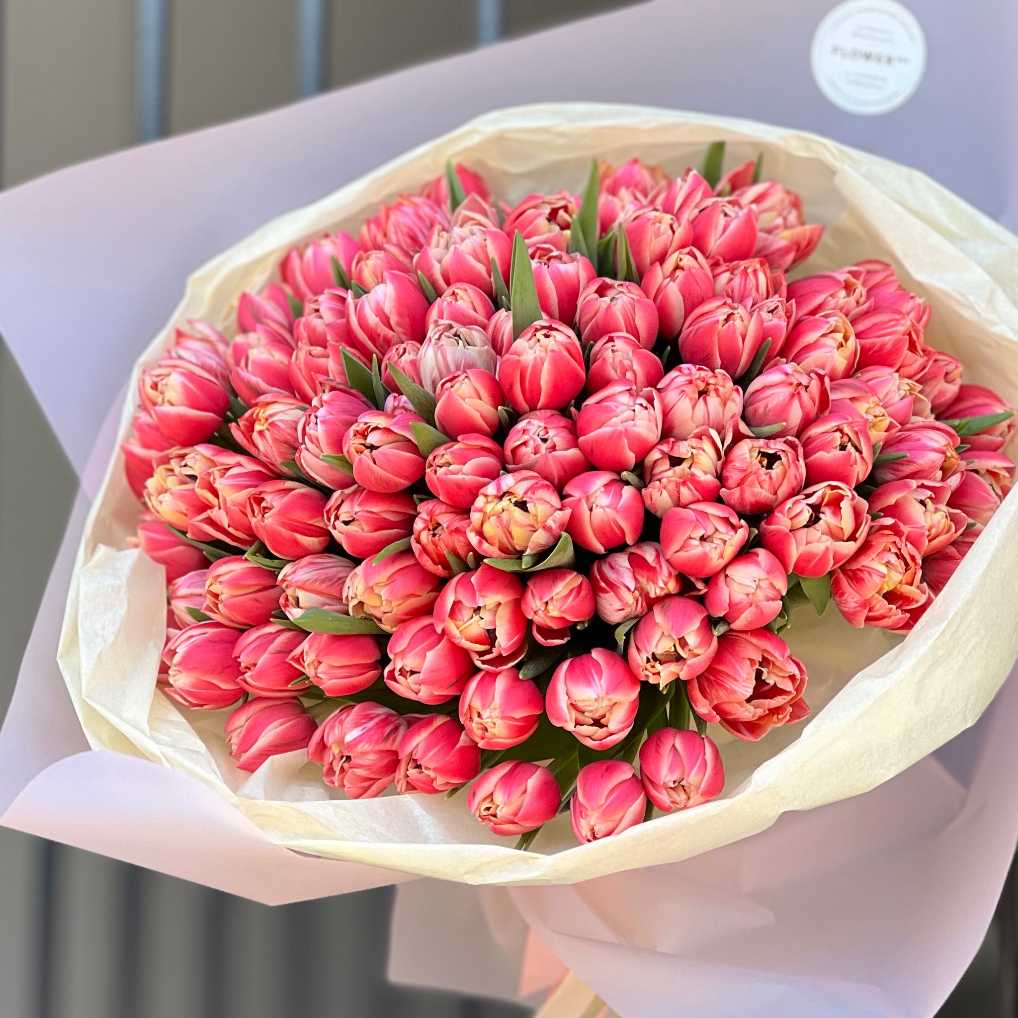 Zdjęcie przedstawia bukiet zawierający 50 i 75 tulipanów.
