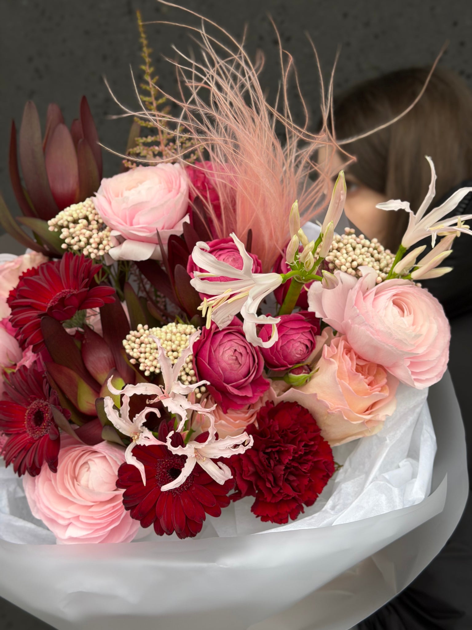 Skład bukietu: gerbera, stipa, astilbe, nerine, ozothamnus, leucadendron, róża gałązkowa, róża.