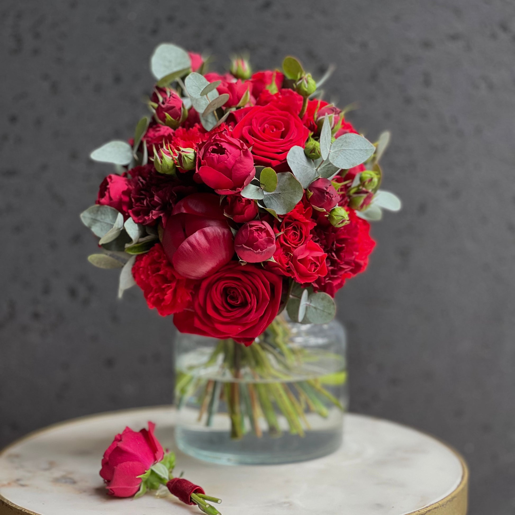 Bouquet composition: rose, spray rose, carnation, eucalyptus, other flowers.