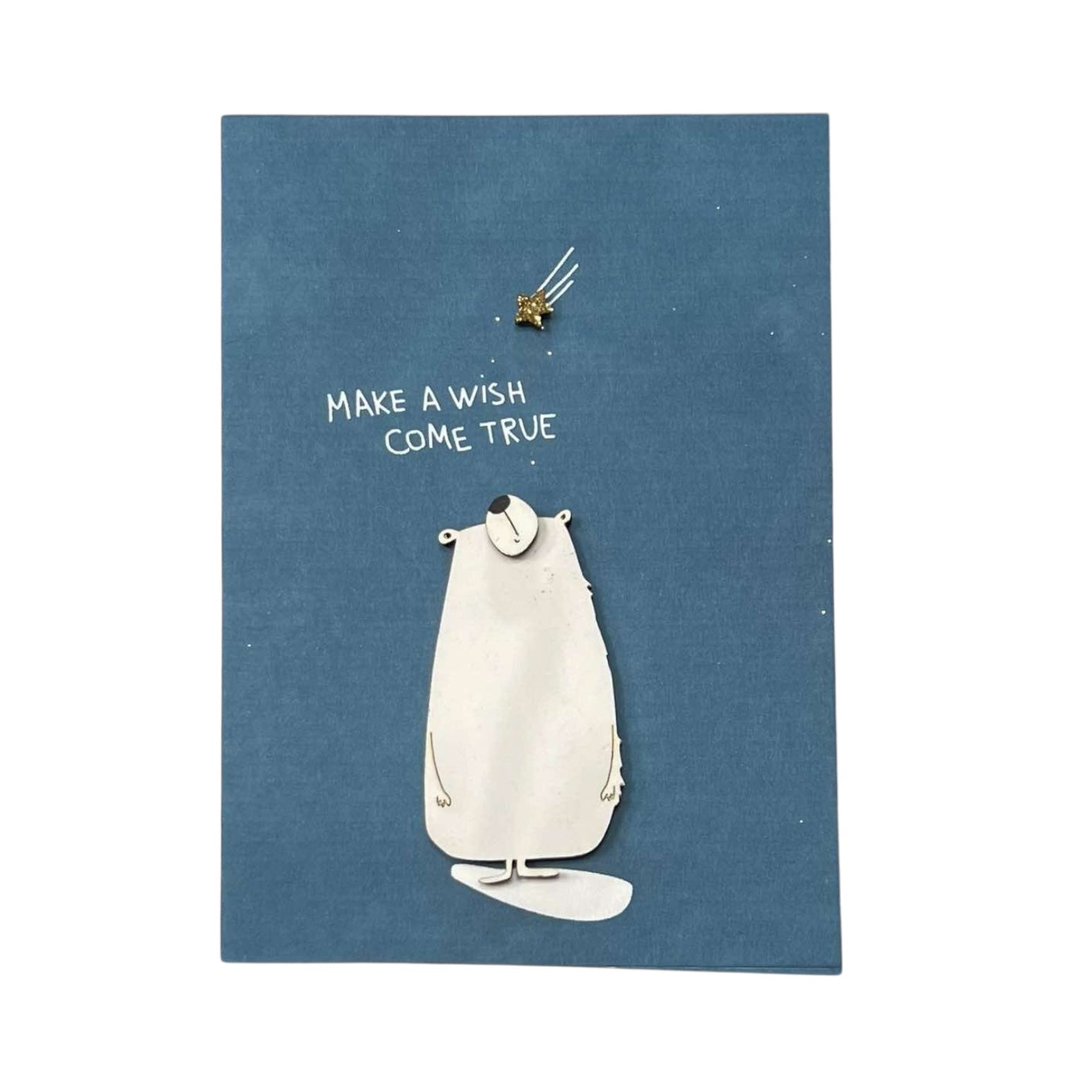 A paper card with a wooden bear and the inscription "make a wish come true".