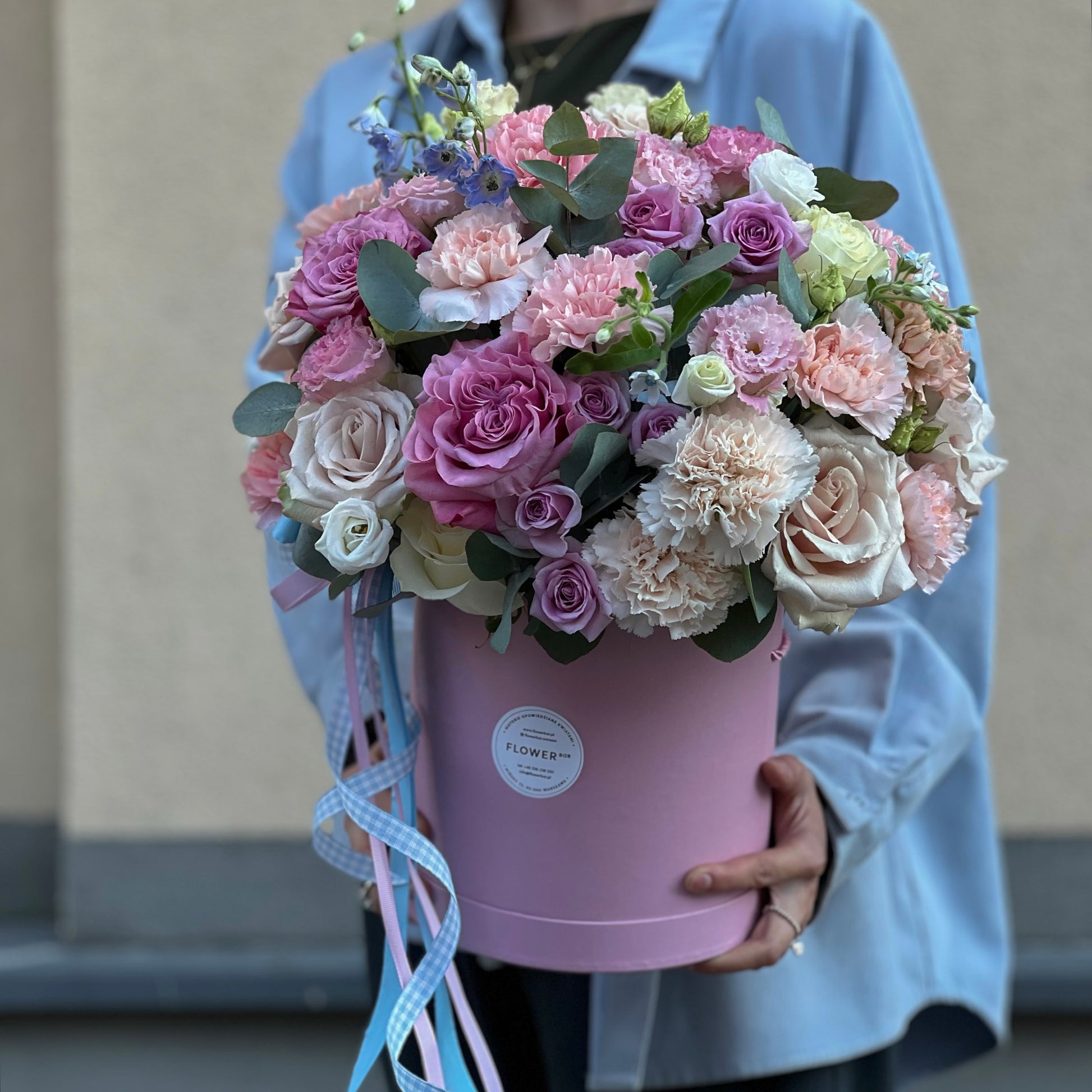 Kwiaty: ostróżka, oxypetalum, eustoma, róża, goździk, róża gałązkowa, eukaliptus.