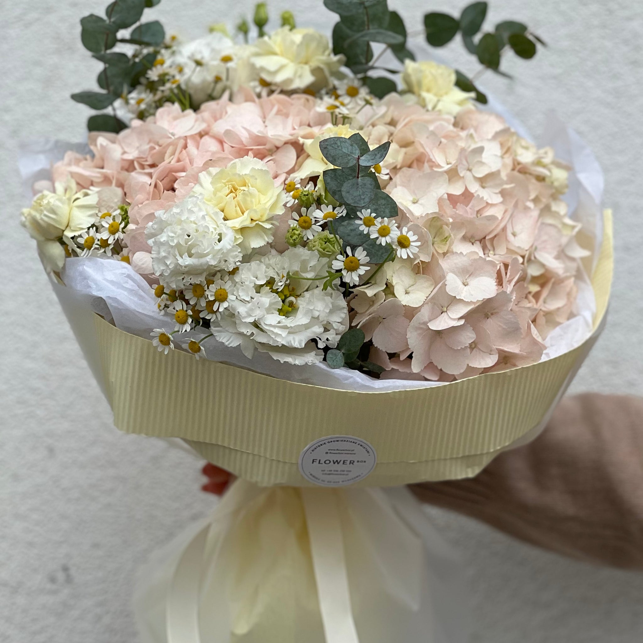 Skład bukietu: hortensja, eustoma, rumianek, goździk, eukaliptus.