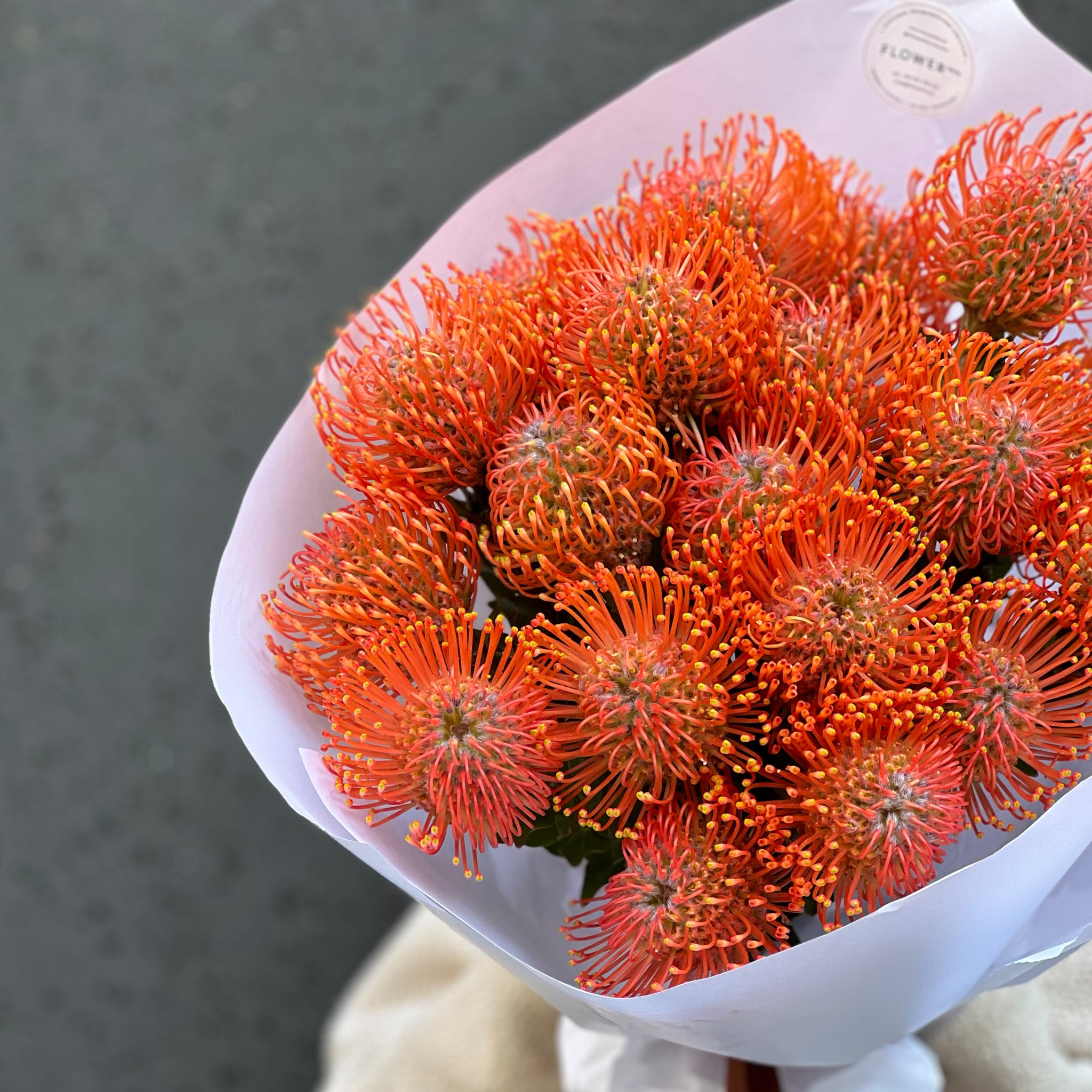 Bukiet z Leucospermum to wyjątkowa, egzotyczna kompozycja o intensywnych barwach, która doda energii i elegancji każdemu.